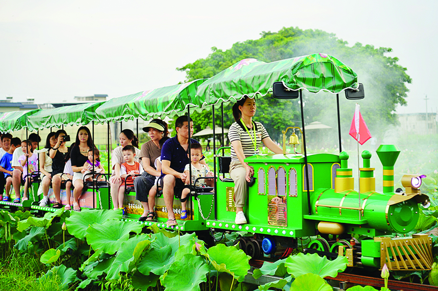 今年,三嘉村百畝荷花園新增的“荷田小火車”項目,成為游客爭相打卡的熱點!白』疖囋诤苫▍仓写┬,荷香陣陣,感覺整個人都放松了。”來自東莞的陳女士帶著家人專程體驗后贊不絕口。這種“低空漫游+高空俯瞰”的立體觀賞體系,讓游客感受到“人在畫中游”的愜意。