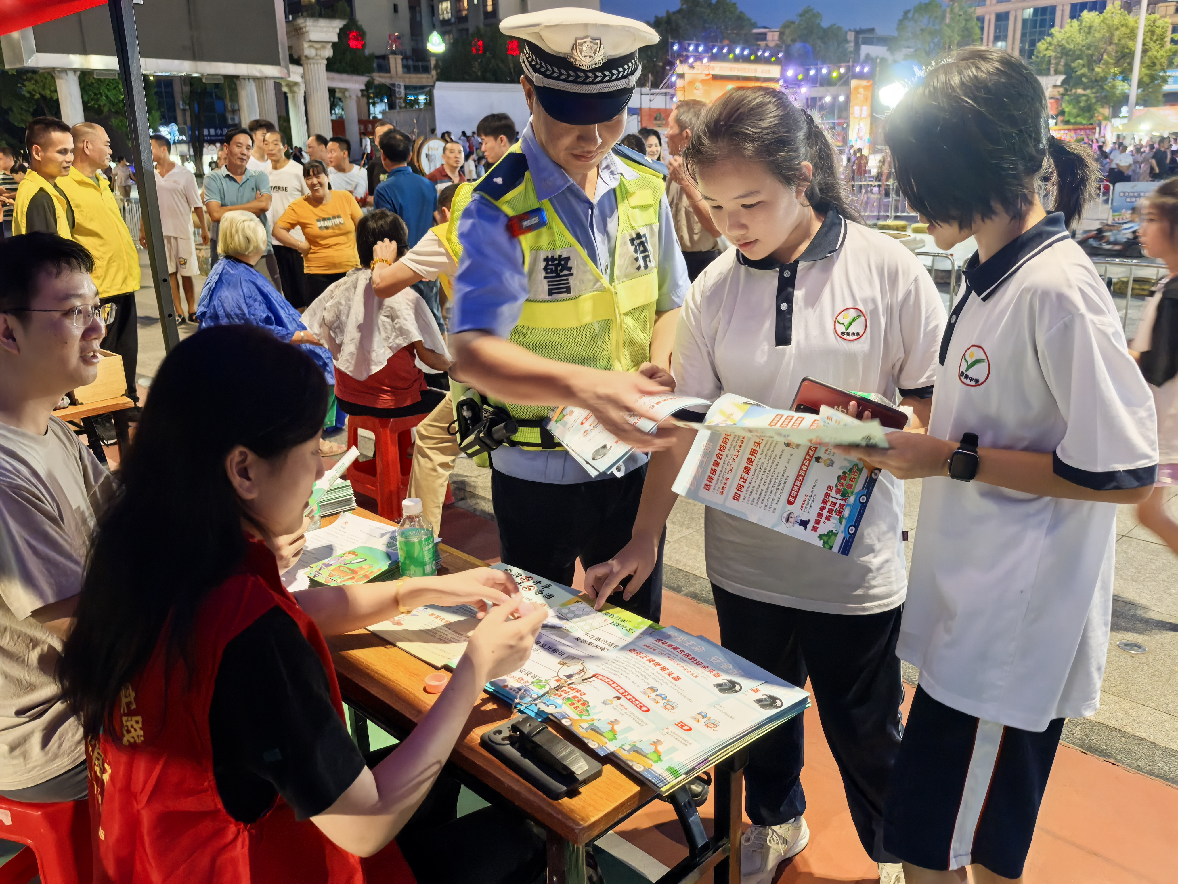 活動當(dāng)晚,6個(gè)主題宣傳攤位整齊排列,應(yīng)急、交通安全、禁毒、工會職工權(quán)益、婦聯(lián)、公共服務(wù)等領(lǐng)域志愿者化身攤主,通過“講解+互動”“案例+問答”的形式,用方言俚語、身邊故事把政策講“活”、道理說“透”。