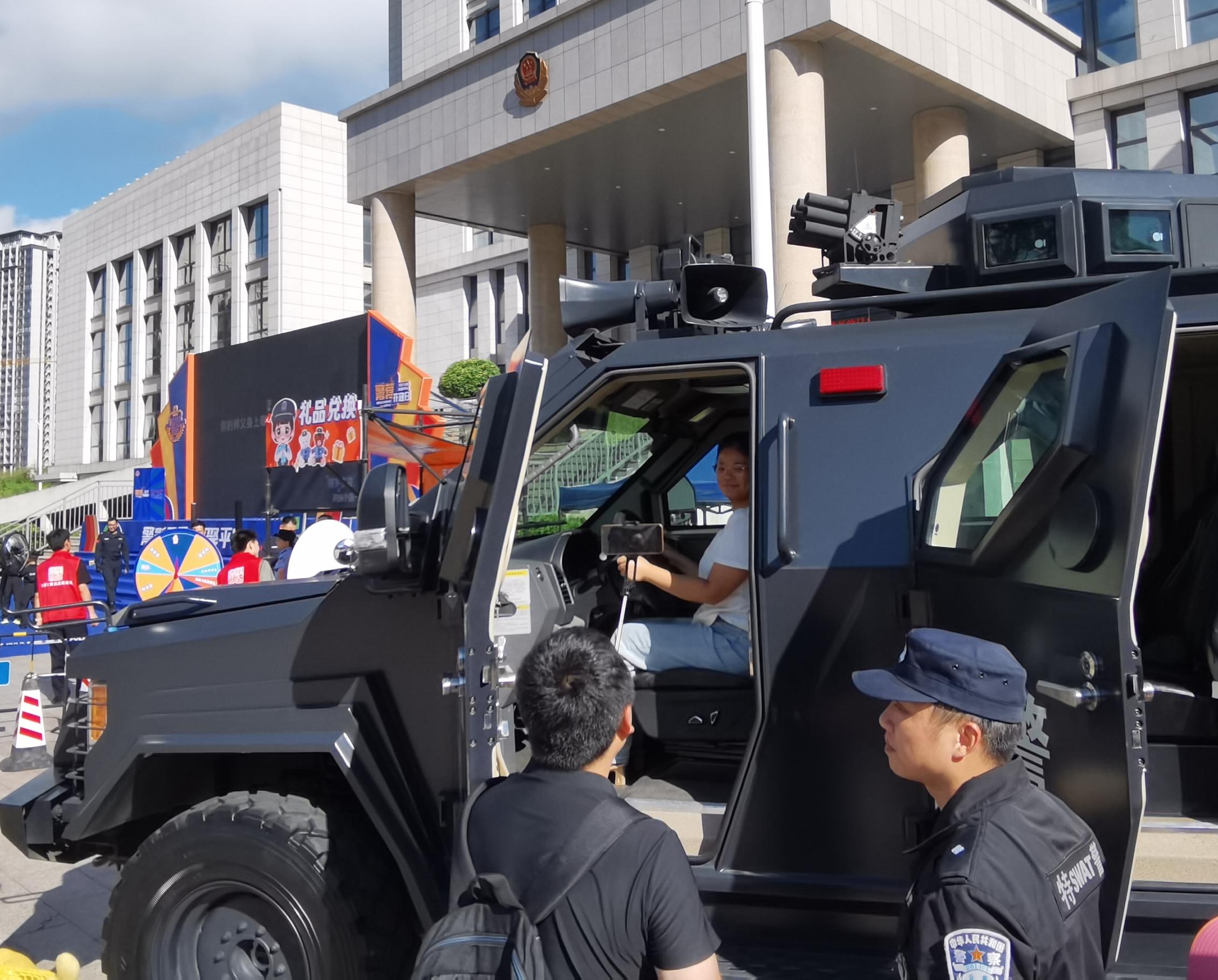 裝備展示區(qū)更成了群眾“零距離”接觸警務(wù)裝備的“科普課堂”。警員們細(xì)致地向群眾講解了盾牌、戰(zhàn)盔、防毒面具、防彈衣等警用裝備的功能及使用規(guī)范;炫酷的警用摩托車、威武的裝甲車等裝備一字排開,成為現(xiàn)場(chǎng)的“網(wǎng)紅打卡點(diǎn)”。小朋友們爭(zhēng)相爬上裝備參觀,眼神里滿是向往,家長(zhǎng)們則舉著手機(jī)記錄精彩瞬間。通過(guò)“看得見(jiàn)、摸得著、問(wèn)得清”的互動(dòng),群眾既認(rèn)識(shí)到警用裝備的嚴(yán)肅性,更真切體會(huì)到警察守護(hù)平安沉甸甸的責(zé)任感。