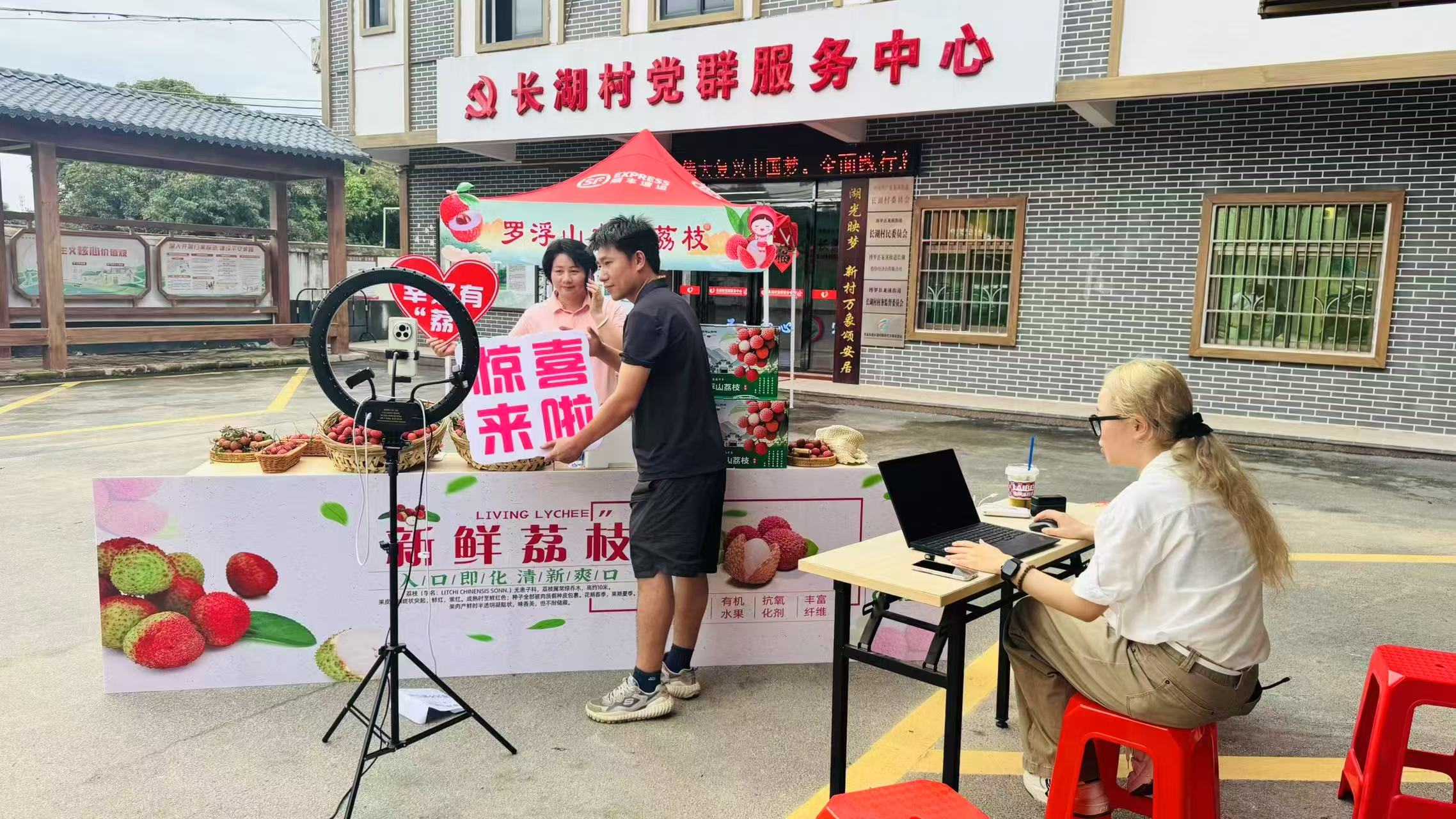 今年荔枝季,長湖村新農(nóng)人利用“鄉(xiāng)村直播間”推介荔枝。龍溪街道供圖