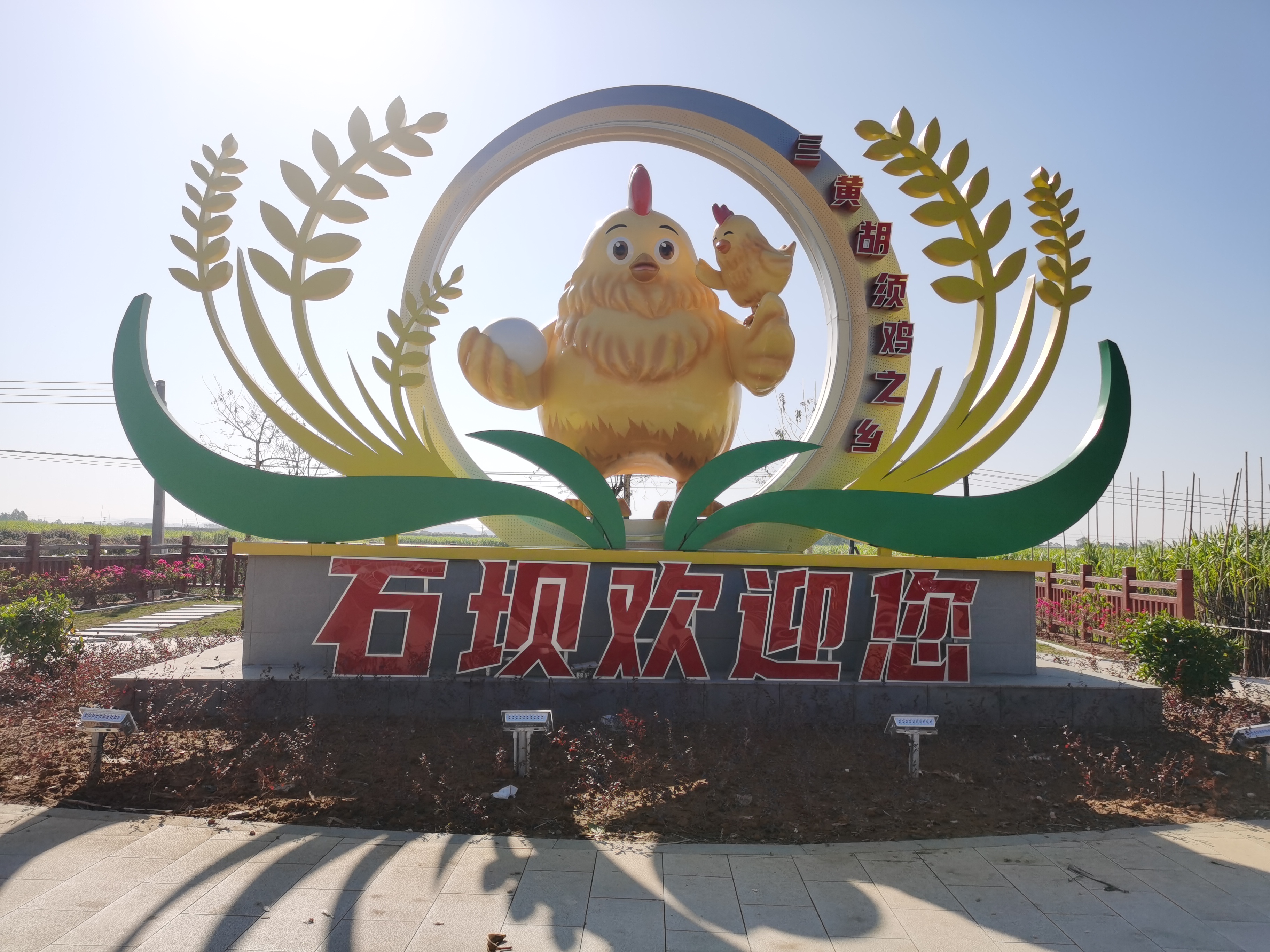 憨態(tài)可掬的“金雞鳴”鎮(zhèn)標(biāo)矗立石壩鎮(zhèn)入口。