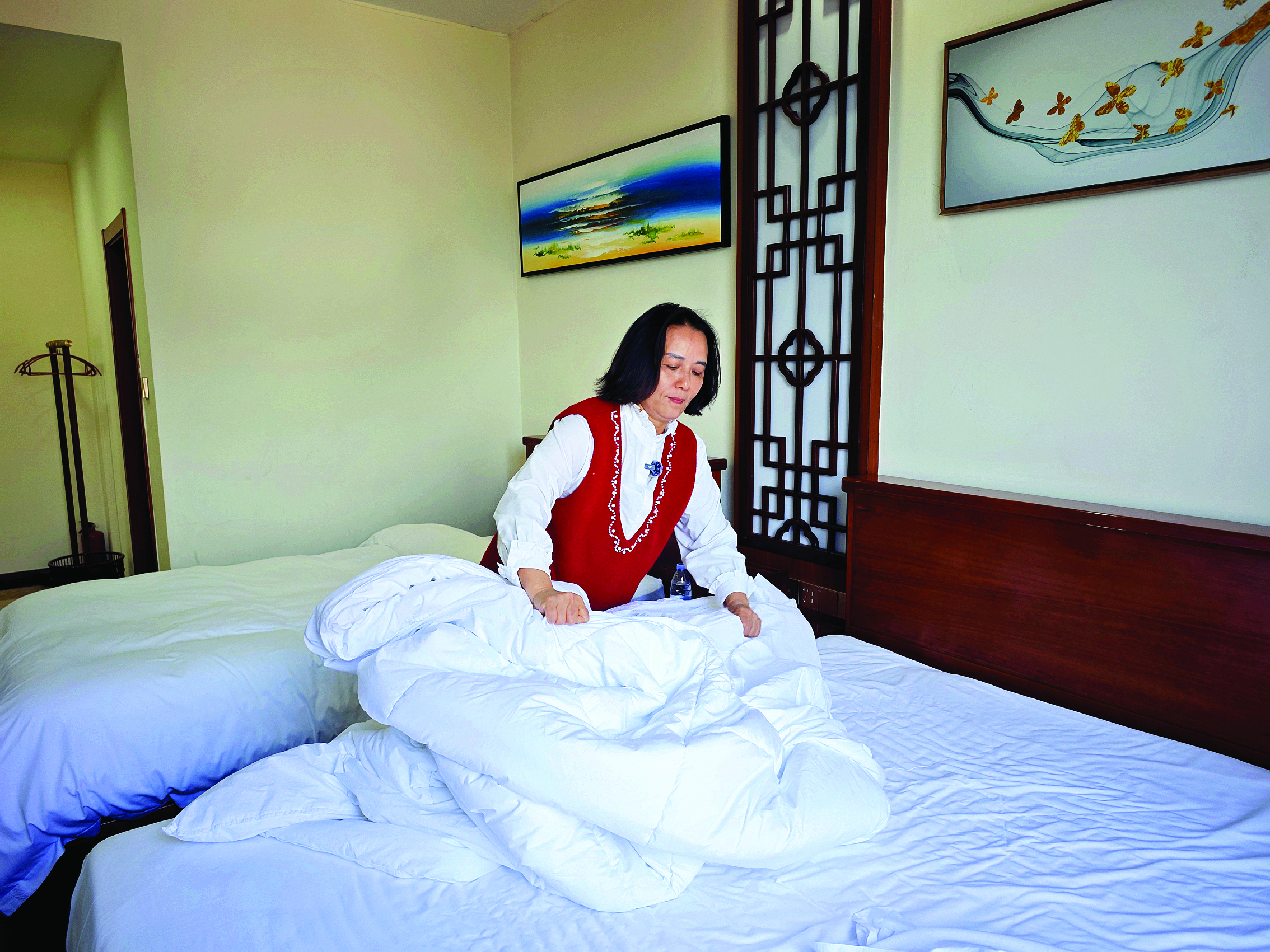 何冬媚在整理民宿客房。