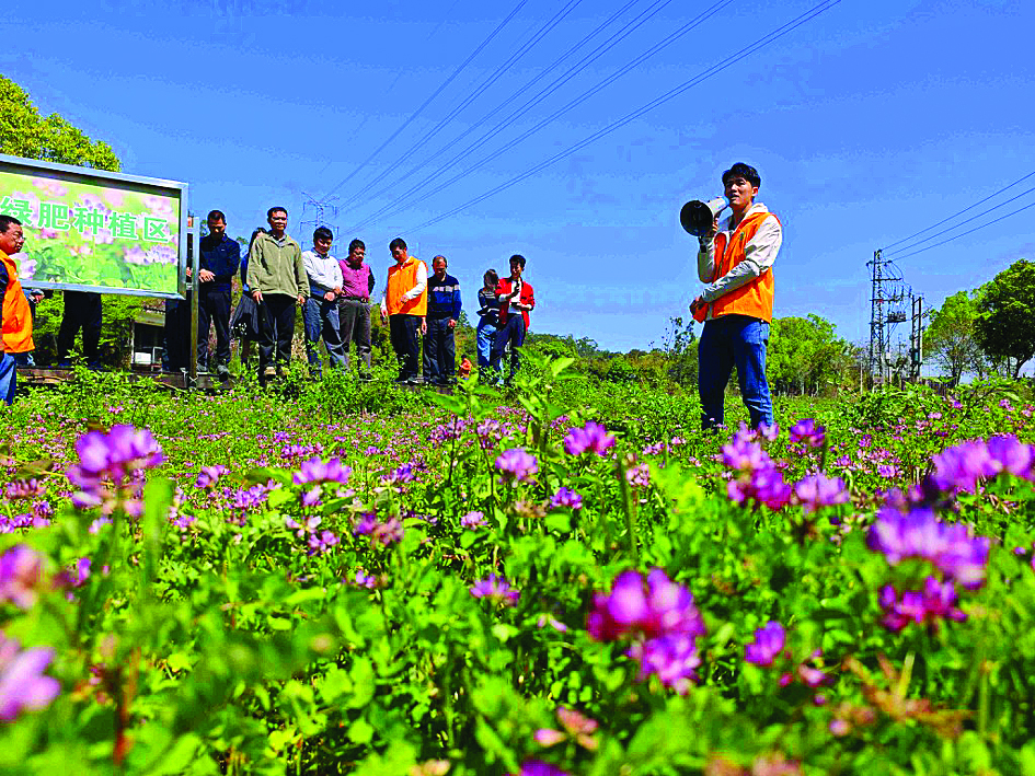 農(nóng)業(yè)技術(shù)骨干、水稻種植大戶觀摩紫云英種植示范區(qū);葜萑請笥浾弑R泓宇 朱子旋 攝