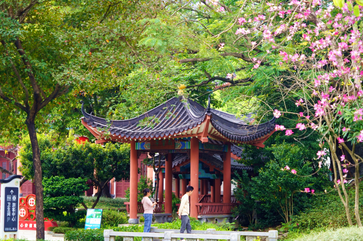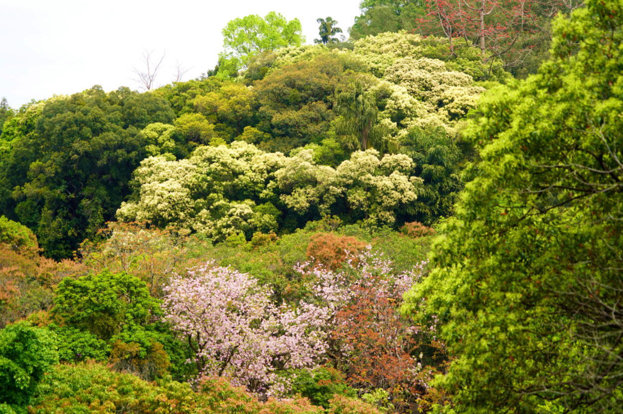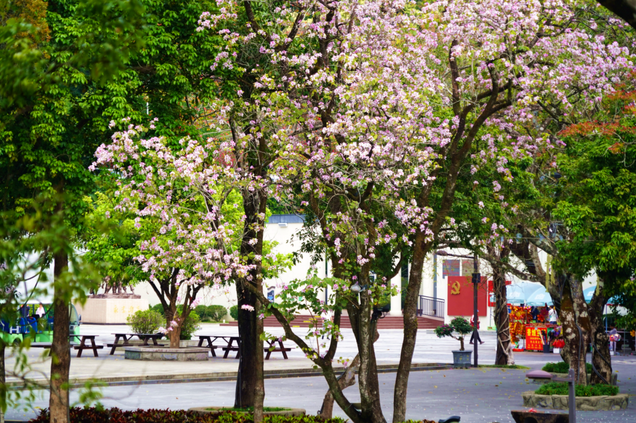 密林與宮粉紫荊相映,暈開一抹溫柔粉霞。