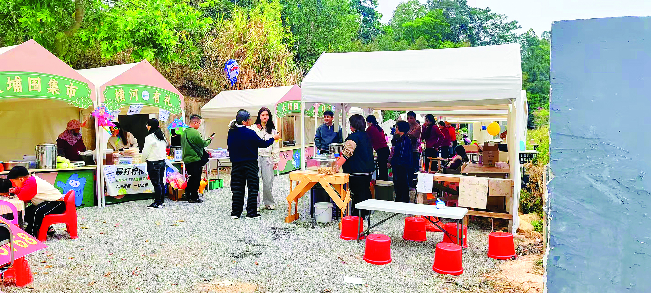 選址、規(guī)劃、設(shè)計(jì)、布置,大埔圍、茅草瀝、白官坳3處閑置場(chǎng)地?fù)u身一變成為整潔有序的臨時(shí)擺賣點(diǎn)。每個(gè)攤位融入橫河本土特色,既實(shí)用又美觀。去年12月,臨時(shí)擺賣點(diǎn)建成投用。賴逸良說(shuō):“顯崗水庫(kù)綠道建設(shè)時(shí),村民們主動(dòng)讓地、全力支持,如今公路通了、綠道美了,引流效應(yīng)凸顯,理應(yīng)讓村民共享發(fā)展成果!庇谑,這些臨時(shí)攤位免費(fèi)向本地村民開(kāi)放,通過(guò)自愿報(bào)名、抽簽選位的方式,讓每個(gè)有需求的村民都能公平享有商機(jī)。