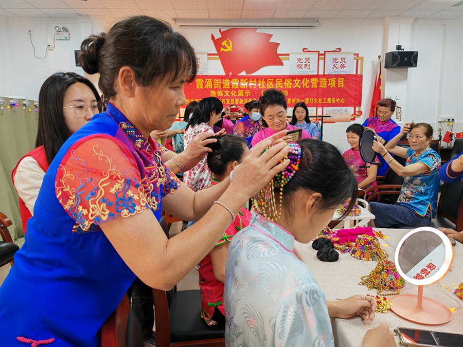 惠州日報訊 (記者匡湘鄂)在美麗的大亞灣區(qū)霞涌街道霞新村,每逢婚嫁、祝壽等喜事或每年的楊包廟會等傳統(tǒng)節(jié)日,村里的婦女們都會盛裝出席,穿上新制的傳統(tǒng)漁家衣服,梳上韻味十足的“仙姑頭”,戴上金燦燦的頭飾,隆重、熱鬧,風(fēng)情無限。日前,霞新村開展了“漁你相約”社區(qū)漁飾文化體驗活動,吸引了眾多市民、游客前來體驗。