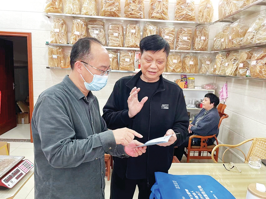 社區(qū)工作人員向沿街商鋪發(fā)放文明宣傳手冊。 惠州日報記者匡湘鄂 曾靜妍 攝