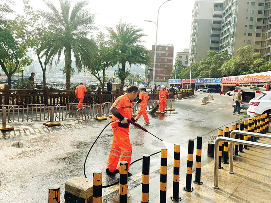 環(huán)衛(wèi)工人正在清洗龍海街。 惠州日報記者匡湘鄂 曾靜妍 攝