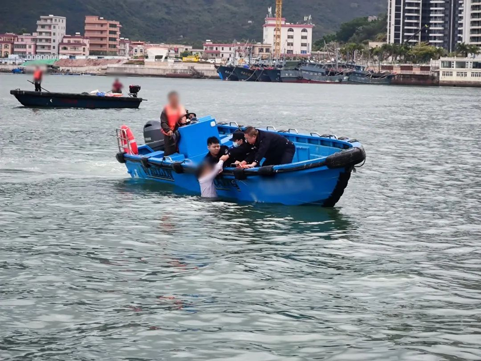 到達(dá)現(xiàn)場(chǎng)后,值班民警發(fā)現(xiàn)一名男子他正搖搖晃晃走向海中去。情況緊急,值班民警立即乘船向男子方向追趕、呼喊:“停下來,有什么事情我們可以慢慢聊一下,不要想不開!”,危急時(shí)刻,澳頭派出所值班民警快速到達(dá)該男子落水點(diǎn),奮力將其拉回船上。