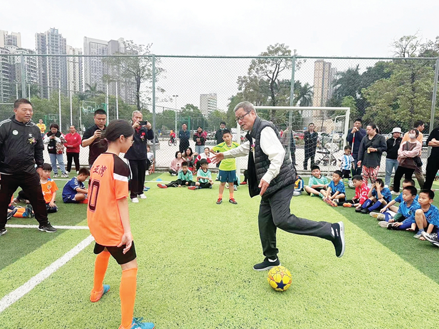 “踢球的時(shí)候要腳尖上翹,用足弓部分擊球的中后部……”在啟動(dòng)禮開始前,一群小朋友圍坐在足球場(chǎng)里,聚精會(huì)神地聽中國(guó)足球協(xié)會(huì)前副主席、中國(guó)足球名宿容志行分享訓(xùn)練經(jīng)驗(yàn)。容志行還面對(duì)面示范了顛球、傳球和過人等球技!澳軌蚩吹铰殬I(yè)運(yùn)動(dòng)員來教我們踢足球,我很開心!眳⒓踊顒(dòng)的小朋友張依帆說。