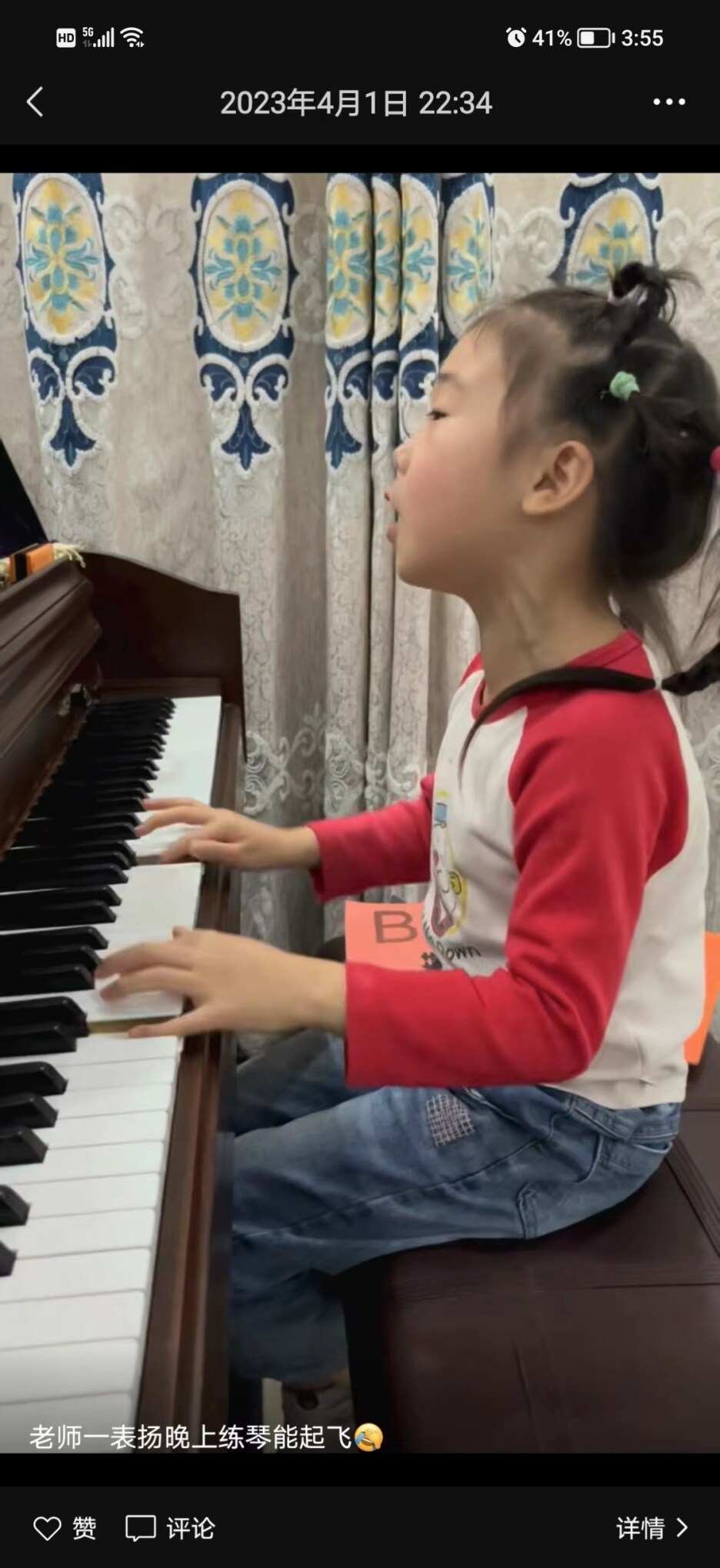 王女士說,4月1日晚上10點(diǎn)半,她看時(shí)間比較晚了,就囑咐云朵彈完最后一遍《我們的祖國是花園》趕緊睡覺,彈的時(shí)候她就用手機(jī)錄了下來。“我跟她說‘哇哈哈’沒有這么快的,她說‘哇哈哈’就是這么歡快的,她對歌曲有自己的理解。”王女士說,當(dāng)時(shí)她在朋友圈也發(fā)了,還配了一段文字“老師一表揚(yáng),晚上練琴能飛起”,說的就是當(dāng)時(shí)云朵一邊彈琴一邊唱的激情狀態(tài)。