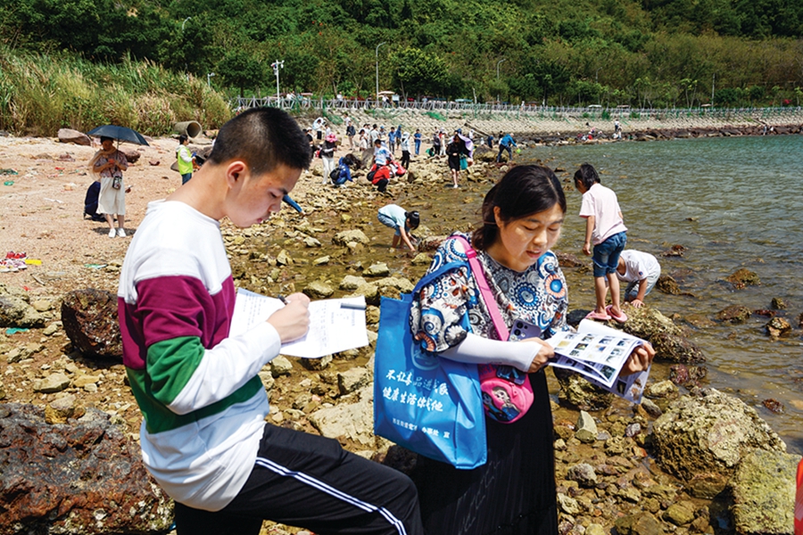 志愿者記錄識(shí)別潮間帶生物;葜萑?qǐng)?bào)記者張宇琪 攝