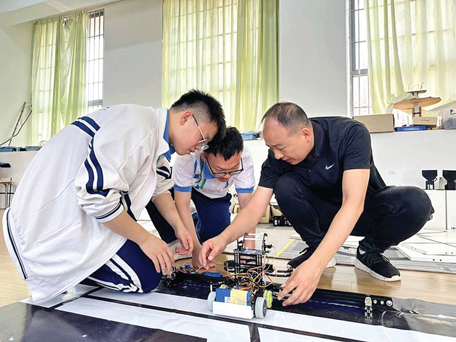 教師指導學生進行機器人搭建與調試;葜萑請笥浾唿S旭新 攝