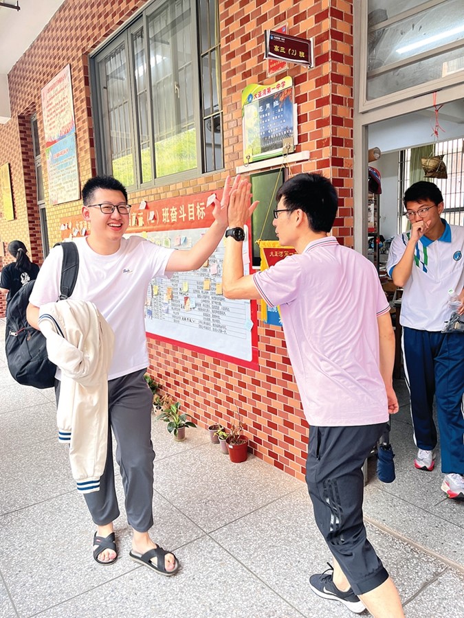 “老師相信你,一定沒有問題的……”正式開考前,在大亞灣第一中學里,教師張素丹與其他教師一起身穿紫色T恤與學生擊掌擁抱!斑@身衣裳寓意著老師對學生們的祝福!睆埶氐ふf,高考首日老師們身穿紅旗袍祝愿學子金榜題名、旗開得勝;第二天身穿紫色T恤表達紫氣東來的祝福!皩W生們精神面貌不錯,從他們的笑容里我看到了信心和對未來的期盼!睆埶氐ふf。