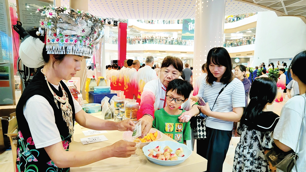 晴隆茶、黃桃、紅心獼猴桃、布依族蠟染服飾……兩天來,黨群“山海同心”工程展示館的市民絡(luò)繹不絕,人們紛紛停住腳步,在這里品嘗芬芳四溢的晴隆茶和水果,體驗獨具特色的民族服飾。