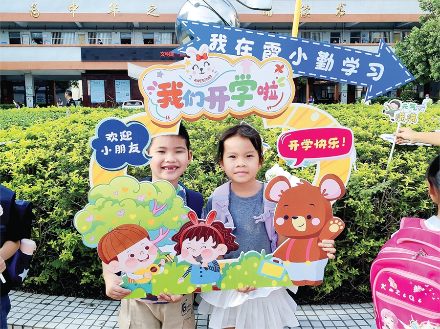 在霞涌第一小學(xué),學(xué)生們?cè)谛iT口拿著可愛的手牌打卡拍照,踏著紅地毯、通過(guò)彩虹拱門進(jìn)入校園。開學(xué)典禮上,全體師生面向冉冉升起的國(guó)旗唱國(guó)歌。