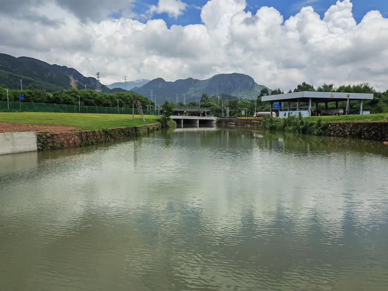 巖前河從山林間流出來后,從惠深沿海高速公路和北環(huán)路橋底下穿過,流過石化區(qū)北門進(jìn)入石化區(qū)。經(jīng)過整治的河道因?yàn)閿r水壩的作用,在這里形成一個(gè)寬闊的水面,河水很是清澈。