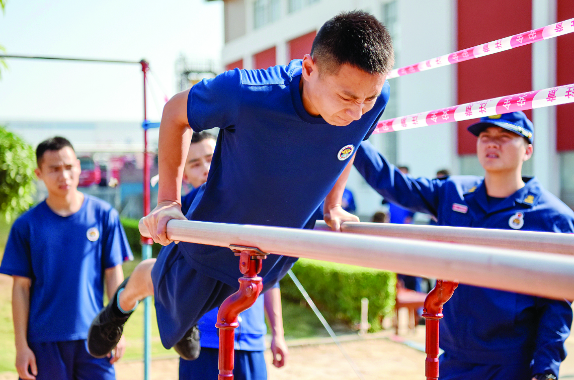 比賽共設(shè)置六個(gè)科目,包括3000米跑、單杠引體向上、雙杠臂屈伸、300米物資接力賽、徒手著重型防化服救人操、移動(dòng)炮出水打靶操。比賽過(guò)程中,隊(duì)員們展現(xiàn)出了高昂的斗志和頑強(qiáng)的精神,現(xiàn)場(chǎng)氣氛熱烈。特別是在徒手著重型防化服救人操項(xiàng)目中,密不透風(fēng)的重型防化服極大地限制了活動(dòng)能力,但是參賽隊(duì)員們的動(dòng)作仍然干凈利落,彼此默契配合,上演了一場(chǎng)場(chǎng)爭(zhēng)分奪秒的“合作救援戰(zhàn)”。