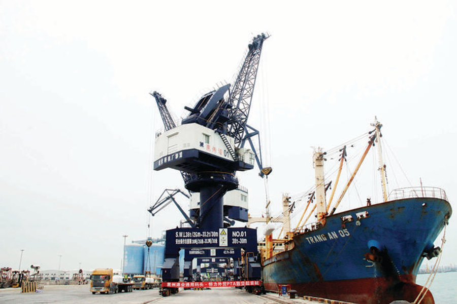 恒力PTA外貿(mào)首船在惠州港業(yè)通用碼頭?垦b船。 惠州日報記者曾靜妍 通訊員林麗濱 攝