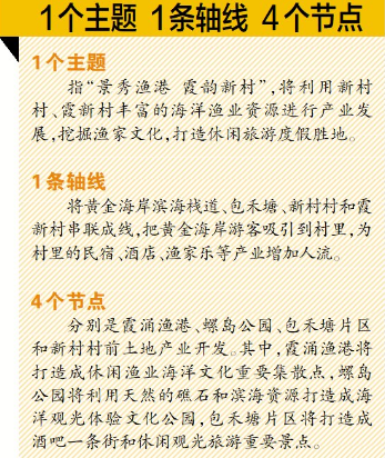 一個(gè)主題是指“景秀漁港 霞韻新村”,將利用新村村、霞新村豐富的海洋漁業(yè)資源進(jìn)行產(chǎn)業(yè)發(fā)展,挖掘漁家文化,打造休閑旅游度假勝地;一條軸線是將黃金海岸濱海棧道、包禾塘、新村村和霞新村串聯(lián)成線,把黃金海岸游客吸引到村里,為村里的民宿、酒店、漁家樂(lè)等產(chǎn)業(yè)增加人流;4個(gè)節(jié)點(diǎn)分別是霞涌漁港、螺島公園、包禾塘片區(qū)和新村村前土地產(chǎn)業(yè)開(kāi)發(fā)。其中,霞涌漁港將打造成休閑漁業(yè)海洋文化重要集散點(diǎn),螺島公園將利用天然的礁石和濱海資源打造成海洋觀光體驗(yàn)文化公園,包禾塘片區(qū)將打造成酒吧一條街和休閑觀光旅游重要景點(diǎn)。