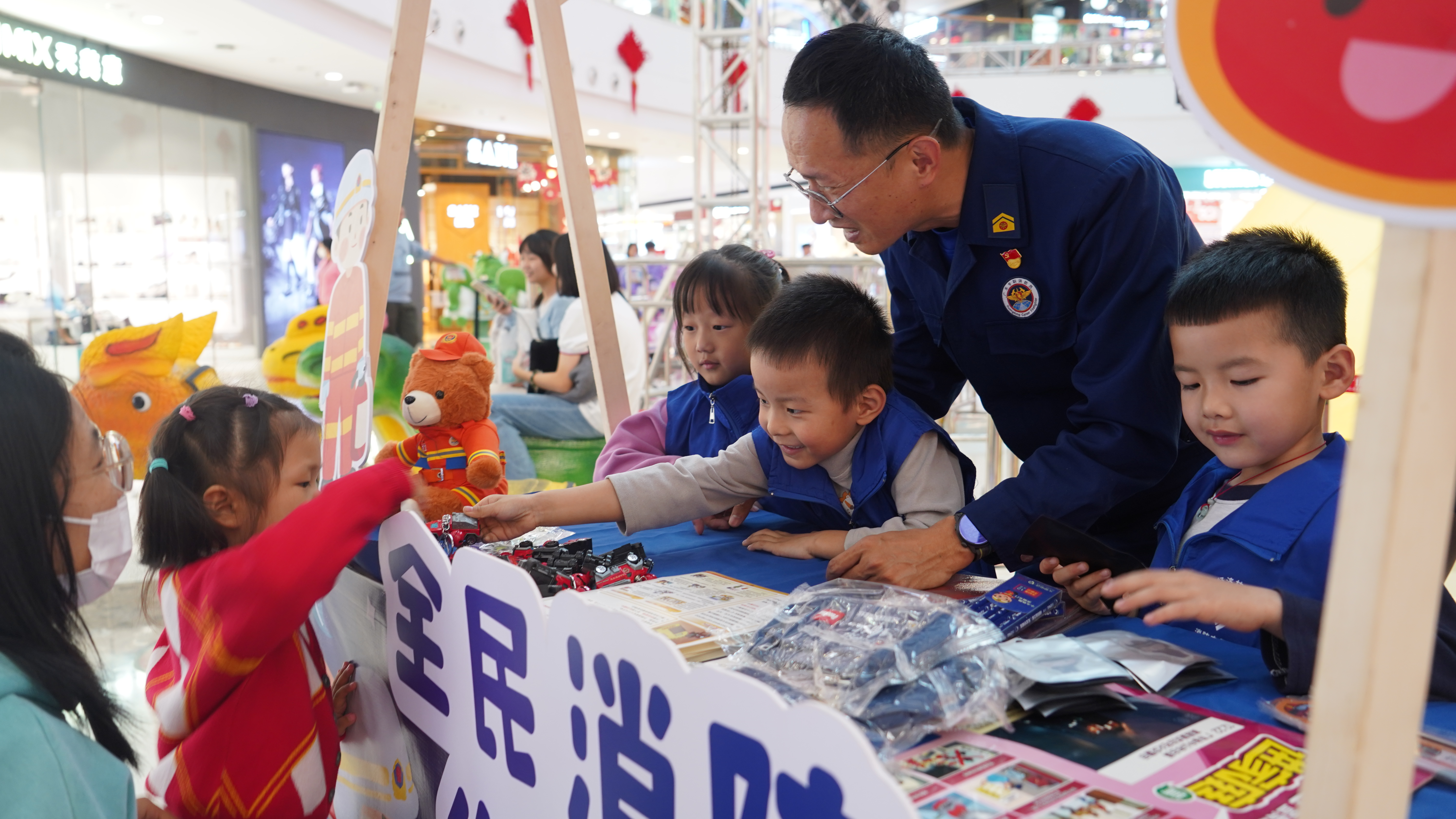 “消防宣傳超市”里擺放著小掛件、冰箱貼、玩具車、文具、公仔等各式各樣的精美消防小禮品,很快吸引了大小朋友駐足參與!盎鹁瘓(bào)警電話是什么?”“消防車是什么顏色?”“發(fā)生火災(zāi)要從電梯還是樓梯逃生?”小志愿者們向他們的同齡小朋友提問(wèn)有關(guān)消防安全的基礎(chǔ)問(wèn)題,提升他們對(duì)消防安全的認(rèn)識(shí)和了解,達(dá)到“教育一個(gè)孩子,帶動(dòng)一個(gè)家庭”的宣傳目的。