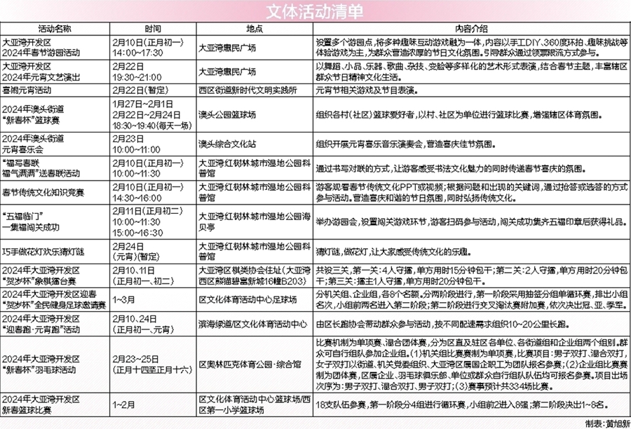 惠州日?qǐng)?bào)訊 (記者黃旭新 通訊員溫艷娜)近日,大亞灣開發(fā)區(qū)發(fā)布2024年春節(jié)元宵期間活動(dòng)整體安排。今年大亞灣在迎新活動(dòng)、文旅產(chǎn)品、服務(wù)保障等各方面精心籌劃,讓在大亞灣過年的市民游客感受年味更濃、市場(chǎng)更旺、煙火氣更足的龍年新春。