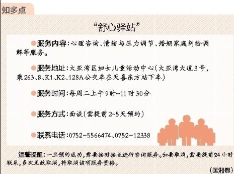 據(jù)了解,大亞灣區(qū)婦聯(lián)“舒心驛站”位于大亞灣區(qū)婦女兒童活動(dòng)中心,主要提供心理咨詢、情緒與壓力調(diào)節(jié)、婚姻家庭糾紛調(diào)解等服務(wù),有需要的婦女兒童和家庭可以提前預(yù)約與心理咨詢師面談。