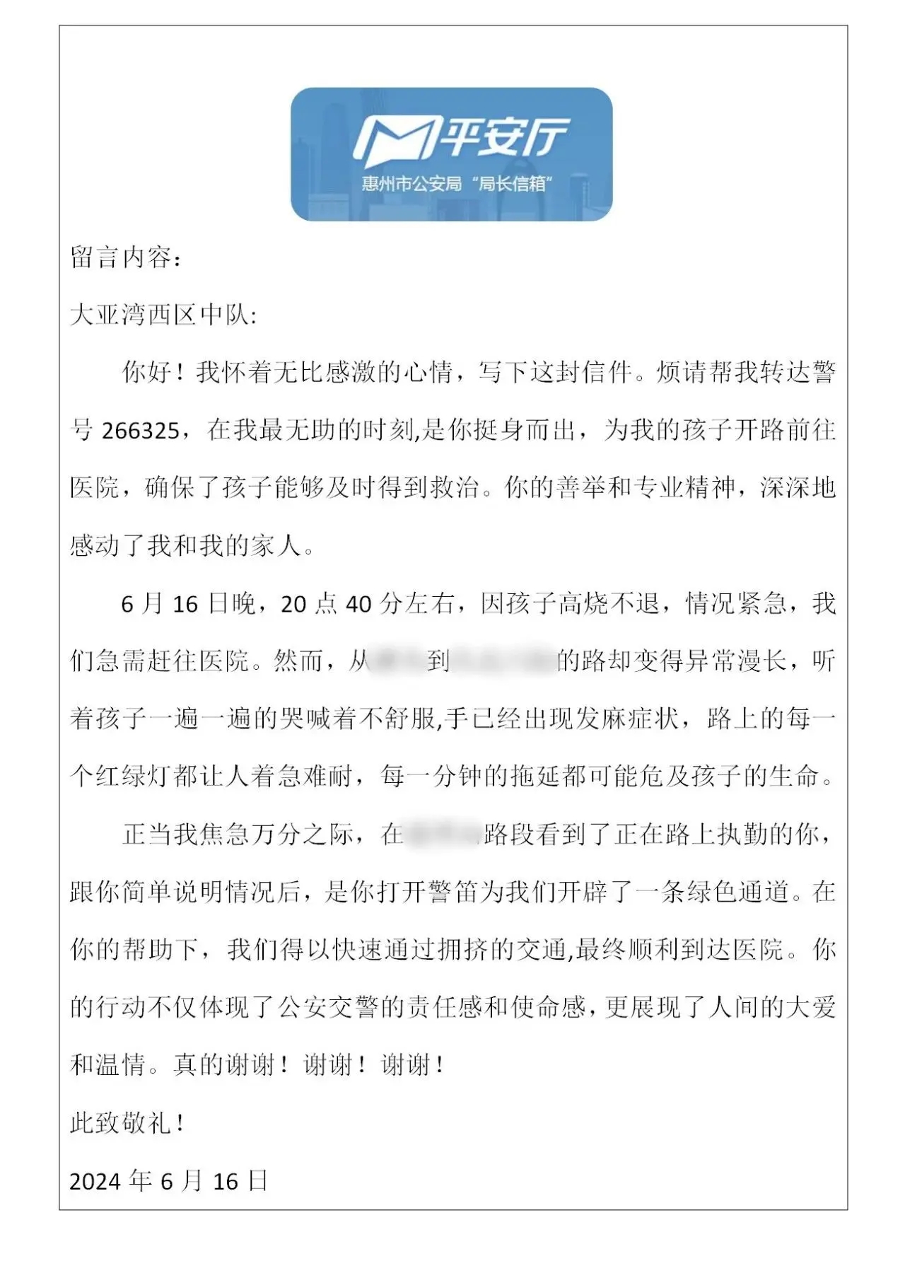 “在我最無(wú)助的時(shí)候,是你挺身而出,讓我的孩子得到了及時(shí)救助!6月16日深夜,“平安廳”信箱收到了寫給大亞灣區(qū)公安分局的一封感謝信,這封信背后的故事源自那個(gè)讓人驚心又溫馨的夜晚。