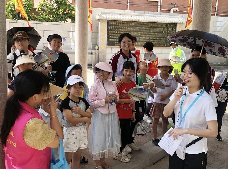 除了紅色小劇場(chǎng),研學(xué)課程中重要的一環(huán)便是帶領(lǐng)孩子們參觀衙前村,近距離了解衙前村各個(gè)特色地標(biāo)建筑的文化歷史。在參觀過(guò)程中,團(tuán)隊(duì)兩位主講人通過(guò)繪聲繪色的講述以及一問(wèn)一答的形式,引起小朋友們的注意,加深對(duì)知識(shí)的記憶。“在撰寫講稿的時(shí)候,我們努力將龐雜的歷史轉(zhuǎn)換為生動(dòng)的語(yǔ)言,并適時(shí)加入有趣的互動(dòng)。”團(tuán)隊(duì)成員梁靜欣說(shuō),講稿完稿后,兩位主講人還在團(tuán)隊(duì)中進(jìn)行排練,傾聽大家的意見,以求達(dá)到更好的宣傳教育效果。