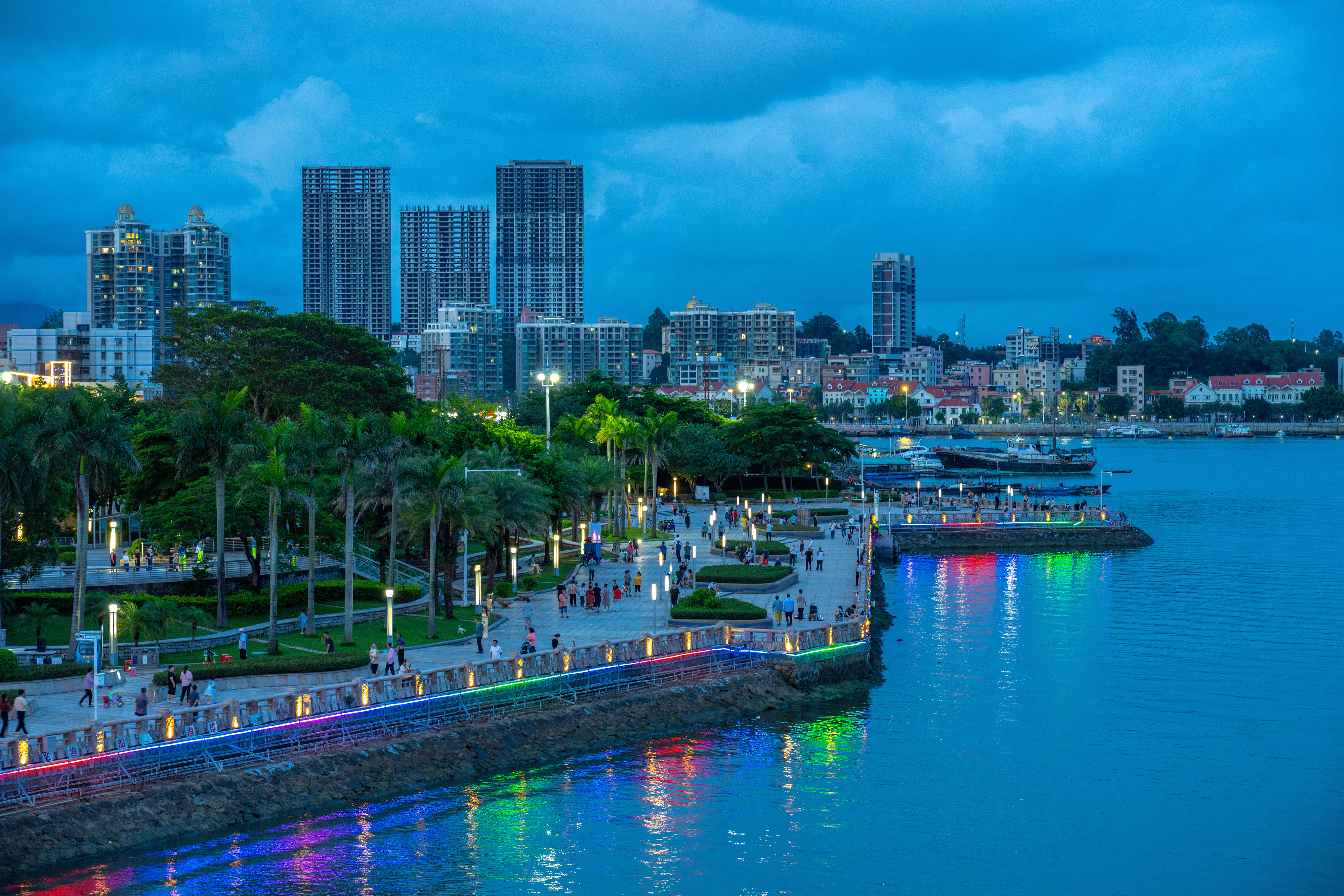 隨著夜幕降臨,澳頭金門塘碼頭霓虹奪目,變得更加絢麗多彩。璀璨的燈光與靜謐的海面交織出美輪美奐的迷人景色,與背后的萬家燈火相互輝映。碼頭前的平臺之上,食客們在此大啖海鮮,就著海風(fēng)談天說地,真是好一幅濱海宜居生活的魅力畫卷。