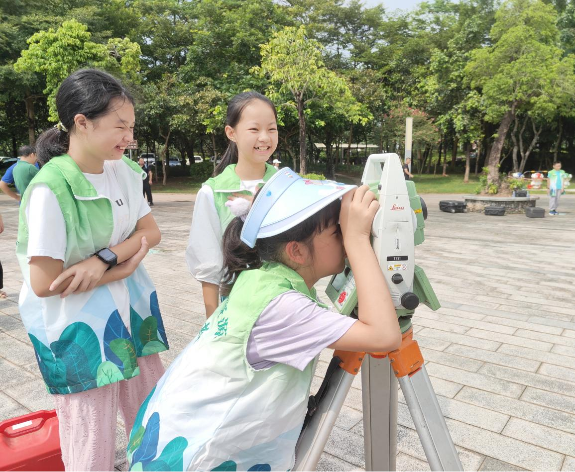 在大亞灣紅樹林城市濕地公園,大亞灣經(jīng)濟(jì)技術(shù)開發(fā)區(qū)測(cè)繪院的工作人員現(xiàn)場(chǎng)演示測(cè)繪儀器的使用,帶領(lǐng)“小記者”們親身體驗(yàn)使用水準(zhǔn)儀、全站儀、GPS測(cè)量議等測(cè)繪裝備,觀看無人機(jī)操作。