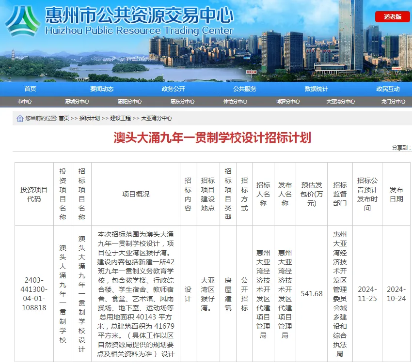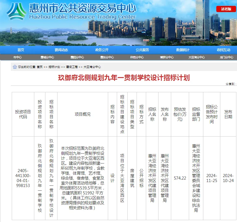 10月24日,惠州市公共資源交易中心連續(xù)發(fā)布多條學(xué)校設(shè)計(jì)和勘察招標(biāo)信息,里面涉及3所規(guī)劃學(xué)校均在大亞灣區(qū),其中,玖御府北側(cè)規(guī)劃九年一貫制學(xué)校、澳頭大涌規(guī)劃九年一貫制學(xué)校、澳頭洗馬湖片區(qū)規(guī)劃初中。