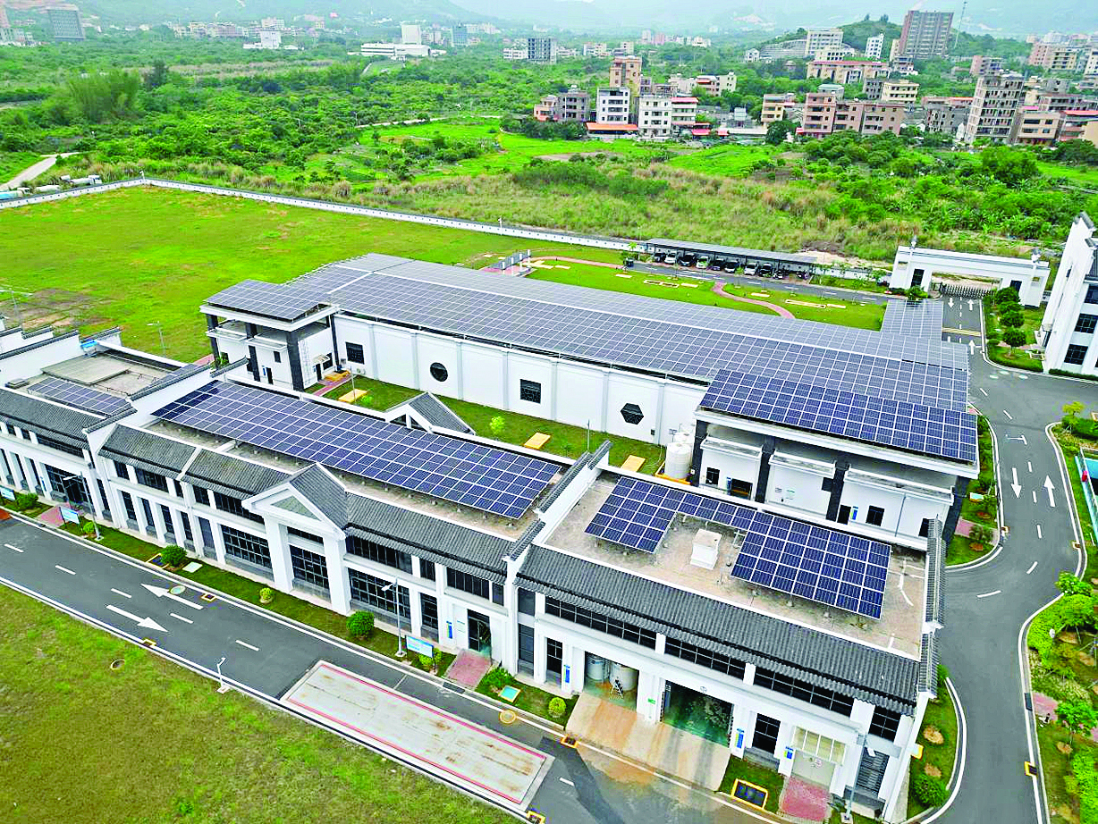 大亞灣第三水質凈化廠位于霞涌街道霞光二路北側,主要功能是處理和凈化大亞灣霞涌區(qū)域的生活污水,設計處理污水能力為35000立方米/天。走入其中,白墻黛瓦的徽式建筑映入眼簾。建筑下,處理污水的設備正有條不紊地運作著,而建筑屋頂上,330平方米的光伏板正吸收著光熱能量,宛如一片“藍!,為污水處理工作持續(xù)發(fā)電。
