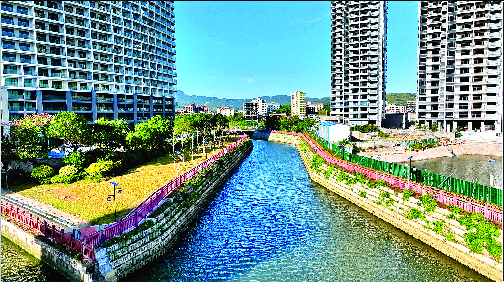 清風(fēng)徐來,水波不興,河面上倒映著藍(lán)天白云和兩岸的美景,沿著嶄新的人行道漫步,心曠神怡。