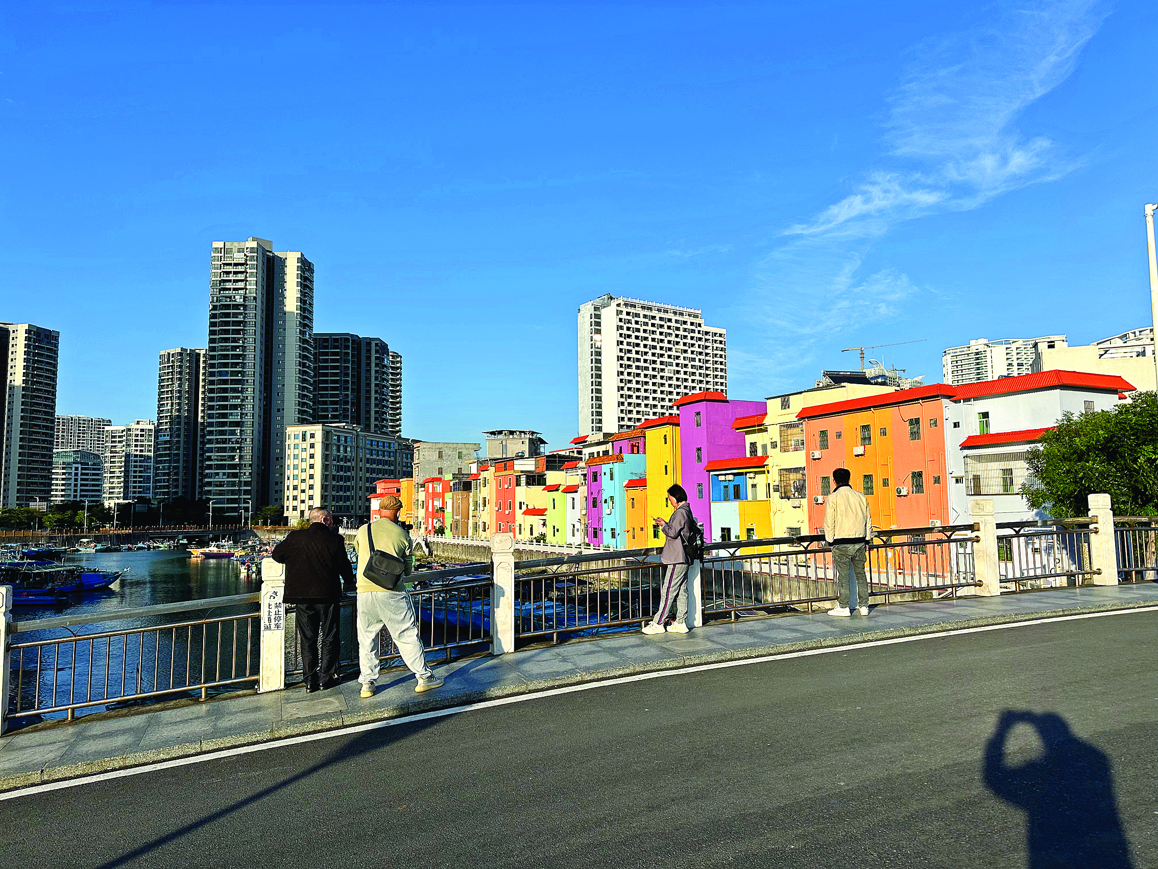傍晚時分,當夕陽的余暉灑在這片彩色的房屋上,整個包禾塘仿佛被鍍上了一層金色。游客們沿著這條街道散步,欣賞著包禾塘里整齊停泊的漁船,看著鷺鳥在水面上自由飛翔,心情格外舒暢。他們紛紛停下腳步,在霞新橋上拍照打卡,記錄美好的瞬間。