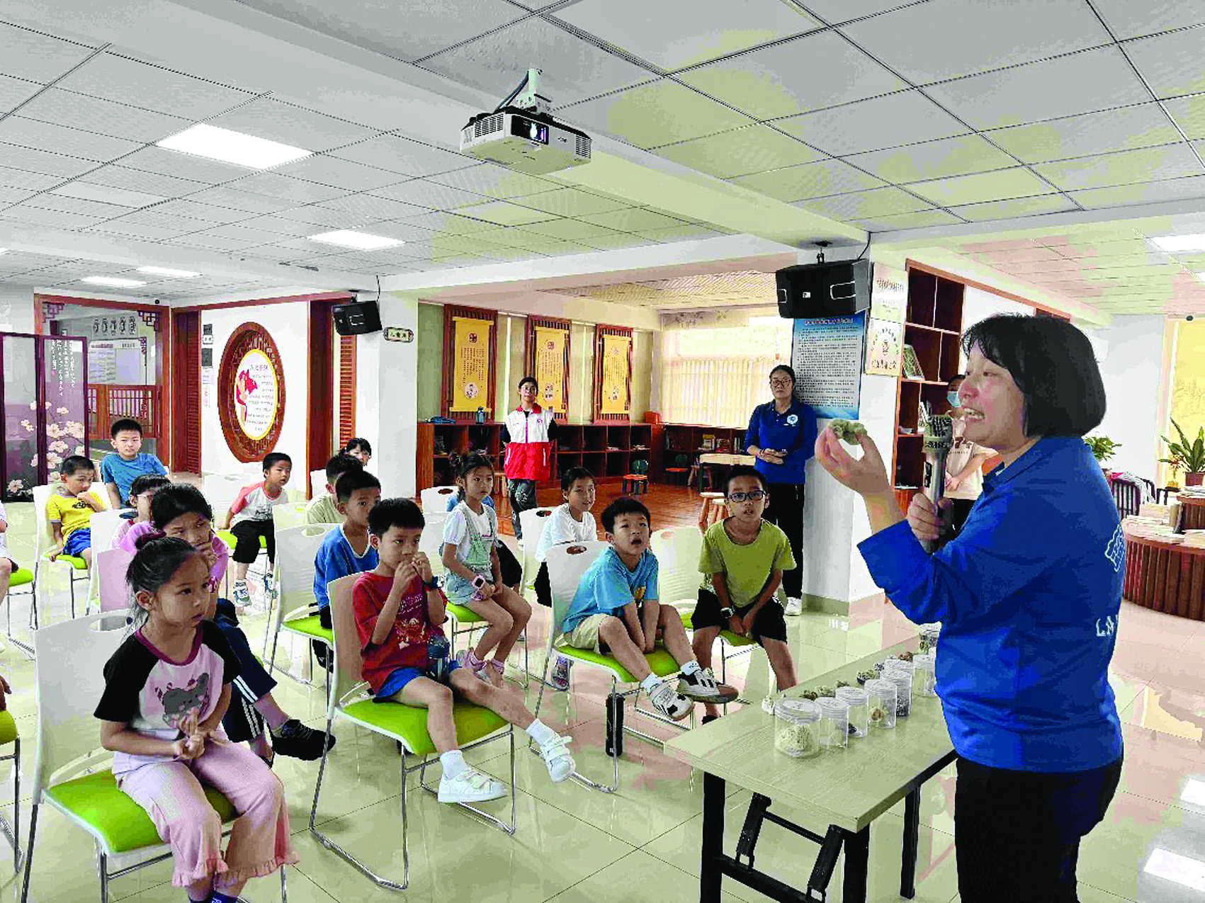 大亞灣區(qū)藍(lán)色海灣公益協(xié)會(huì)志愿者給社區(qū)兒童科普海洋生物。 惠州日?qǐng)?bào)記者匡湘鄂 通訊員黃海洋 攝