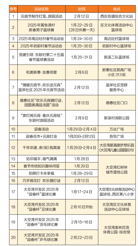 惠州日?qǐng)?bào)訊 (記者匡湘鄂 通訊員溫艷娜)隨著2025年春節(jié)的臨近,大亞灣區(qū)為居民們準(zhǔn)備了一系列豐富多彩的節(jié)日活動(dòng)。從春節(jié)假期前至元宵節(jié)期間,各項(xiàng)活動(dòng)輪番上演,為居民們提供了多樣化的娛樂選擇。