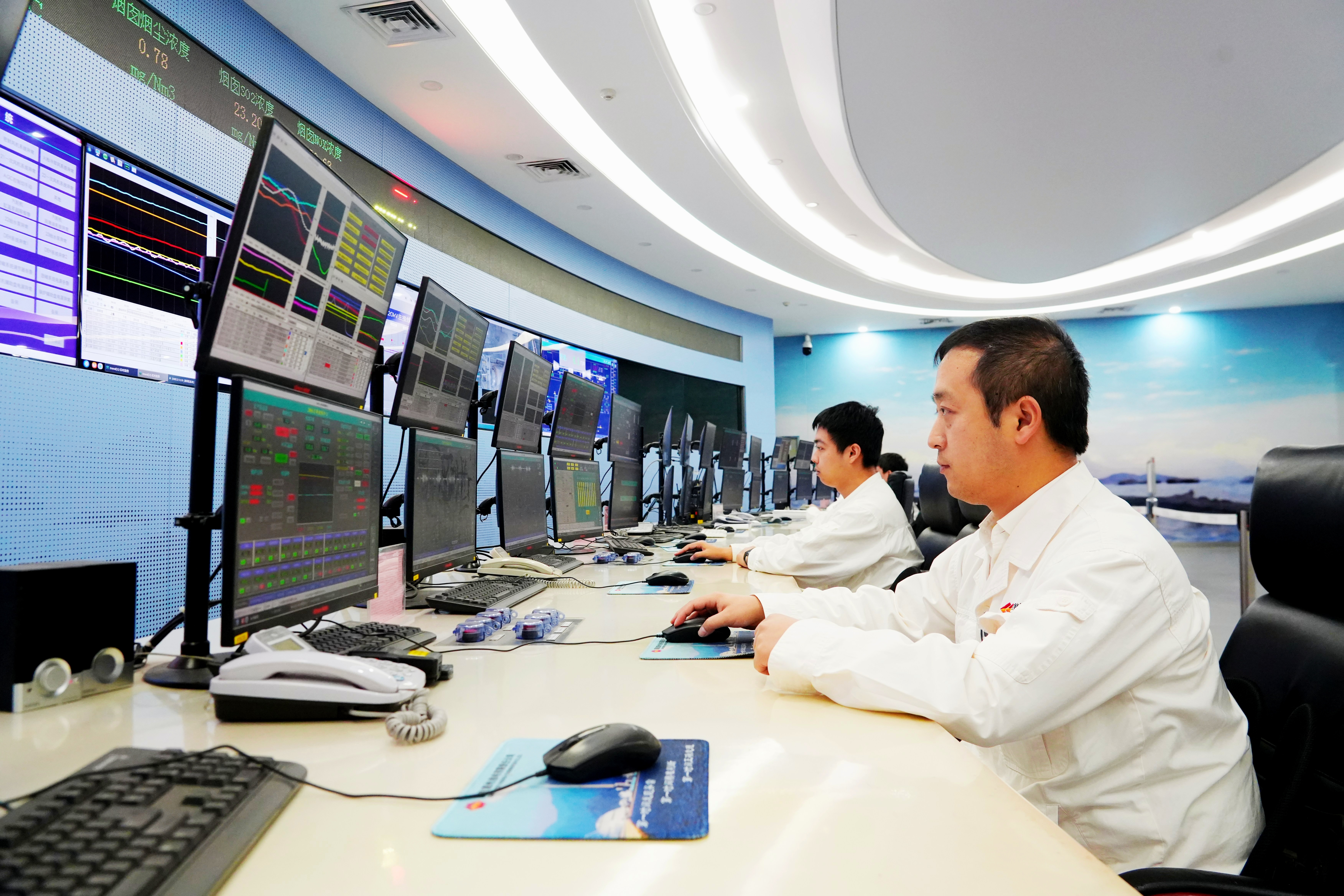 國能惠州電廠二期中控室智能管理平臺(tái)大屏實(shí)時(shí)呈現(xiàn)生產(chǎn)進(jìn)度、設(shè)備運(yùn)行狀態(tài)等情況。