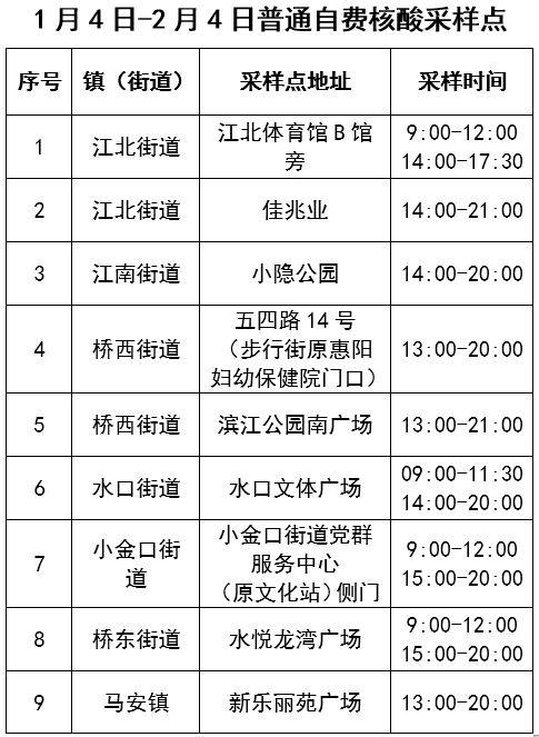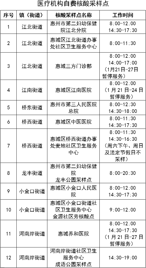 1月4日-2月4日,惠城區(qū)共設(shè)置31個自費(fèi)核酸采樣點(diǎn),其中普通自費(fèi)核酸采樣點(diǎn)9個(詳見表1),醫(yī)療機(jī)構(gòu)自費(fèi)核酸采樣點(diǎn)22個(詳見表2)。