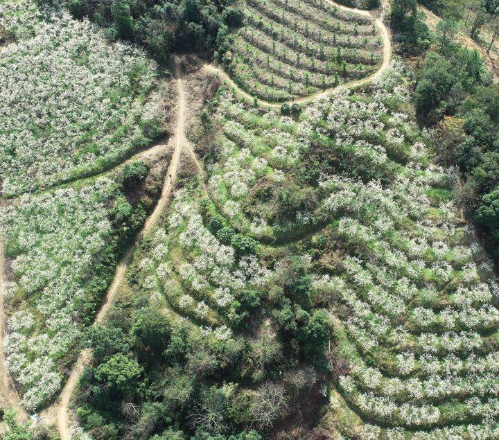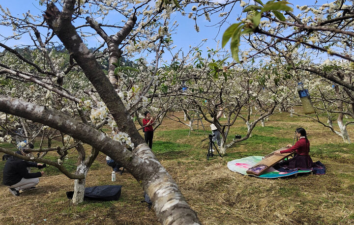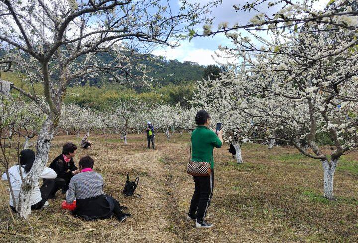從蘆洲鎮(zhèn)中心出發(fā),鄉(xiāng)道的公路寬闊平坦,很快就來(lái)到大興村。進(jìn)入大興村,眼前正在盛開(kāi)的李花像雪花飄落在枝條一樣,十分優(yōu)美。游客朋友或三五個(gè)好友在李花前擺拍,或情侶成對(duì)在李花下漫步,或在李花下坐著彈一曲古箏……