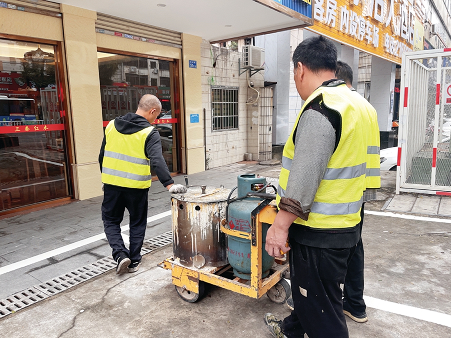 工作人員在開(kāi)展停車格劃線工作。 惠州日?qǐng)?bào)記者鄧惠婷 特約通訊員周文媚 通訊員曾苑嬌 李雙飛 攝