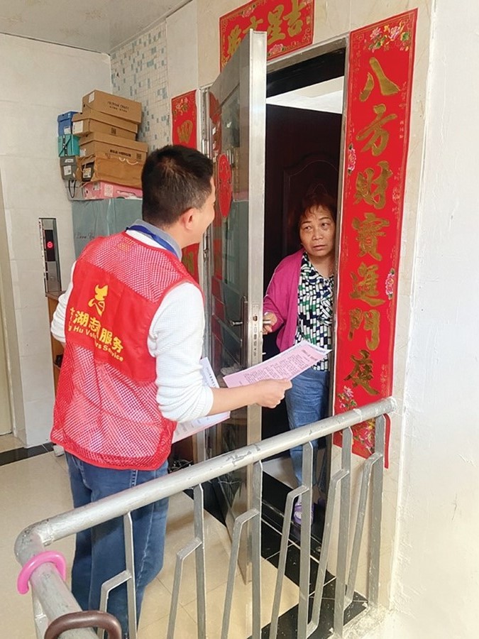 文昌社區(qū)黨員志愿者上門宣傳。