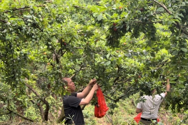 參加李子節(jié)活動的游客在大興李子園采摘李子。