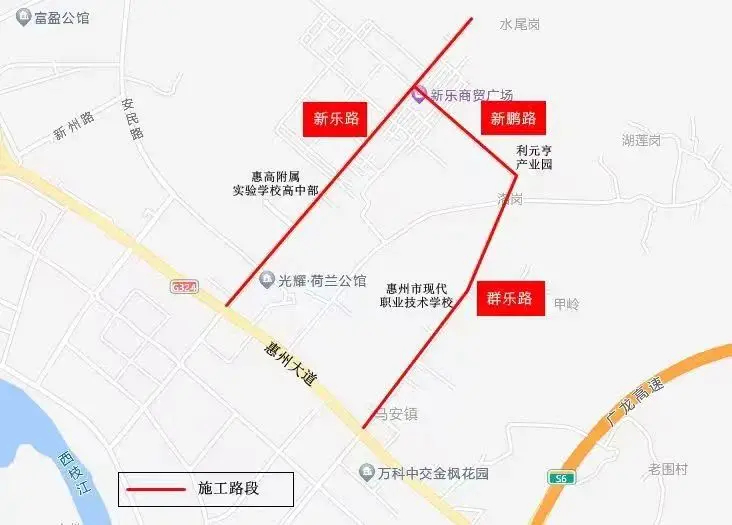 5月13日至施工結束(工期預計19個月)施工期間,將圍蔽群樂路、新鵬路、新樂路半幅路面,另一幅路面保持雙向通行。途經車輛可選擇繞行新樂二路、新樂三路、新樂四路、新樂五路、鄉(xiāng)道YG69、惠州大道等道路。