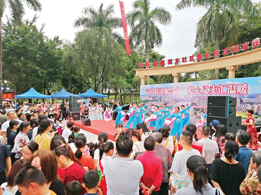 在惠城區(qū)橋東街道荷鄉(xiāng)社區(qū)新時(shí)代文明實(shí)踐廣場(chǎng),“六社聯(lián)動(dòng)聚合力 愛(ài)心義賣匯溫暖”公益市集活動(dòng)正在熱火朝天地開展,臺(tái)上各種歌舞節(jié)目接連上演,臺(tái)下愛(ài)心義賣攤位一字排開,現(xiàn)場(chǎng)人流涌動(dòng),黨員們結(jié)合“黨員回家 服務(wù)萬(wàn)家”工程開展志愿服務(wù),周邊商家捐贈(zèng)義賣商品和提供公益服務(wù),居民則當(dāng)起攤主,用行動(dòng)支持家門口的公益活動(dòng);顒(dòng)持續(xù)5個(gè)小時(shí),募集善款1.5萬(wàn)余元。