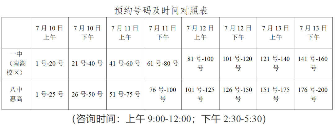 、巯到y(tǒng)將返回預(yù)約號和有關(guān)信息,對照“預(yù)約號碼及時間對照表”,家長應(yīng)當(dāng)在7月11日下午到第八中學(xué)(統(tǒng)一咨詢點(diǎn))進(jìn)行咨詢。