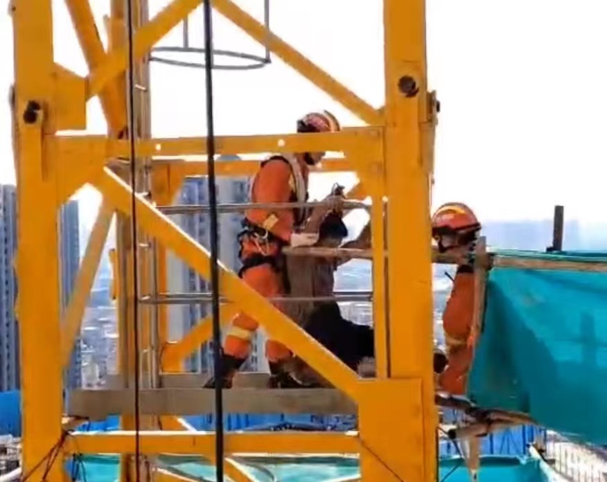 下午4時(shí)30分,現(xiàn)場(chǎng)指揮員果斷下達(dá)救援命令,兩名戰(zhàn)斗經(jīng)驗(yàn)豐富、戰(zhàn)斗作風(fēng)過(guò)硬的消防員隨塔吊司機(jī)共同登塔實(shí)施救援。