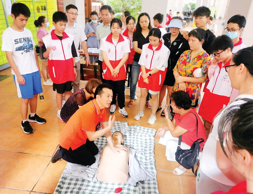 市第三人民醫(yī)院急診科黨員醫(yī)生在所在社區(qū)教居民學(xué)習(xí)心肺復(fù)蘇術(shù);葜萑請笥浾吲砑t霞 通訊員羅仕嬋 攝