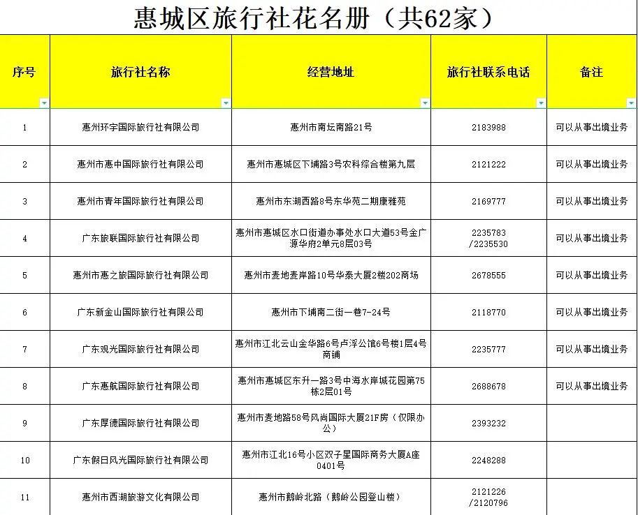后期旅行社名單更新可登錄“惠州市惠城區(qū)文化廣電旅游體育局政府信息公開平臺”進行查詢,也可以關(guān)注“惠城文旅體”微信公眾號信息。