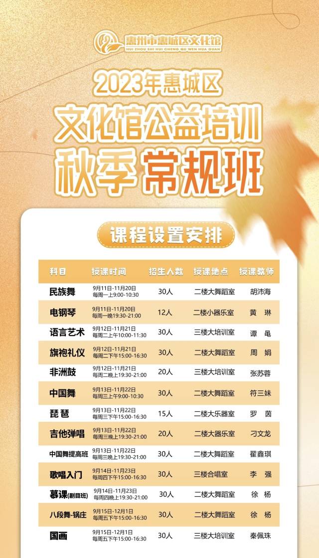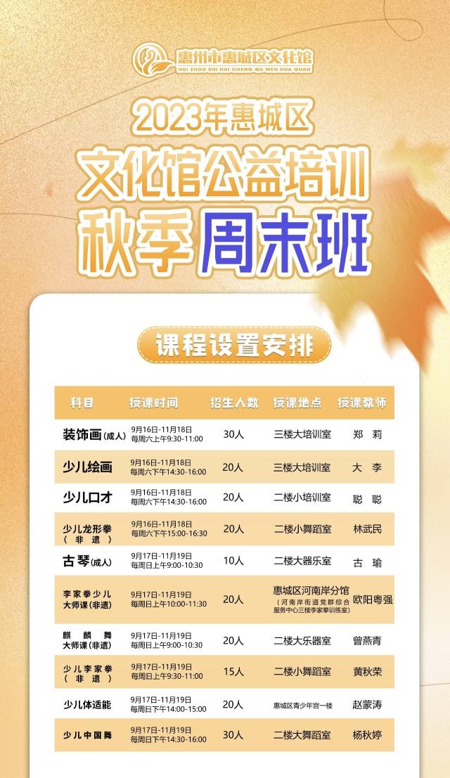 惠城區(qū)文化館相關(guān)負(fù)責(zé)人介紹,此次公益培訓(xùn)班分為常規(guī)班和周末班,依舊新增晚課和非遺課程,共為期3個(gè)月。